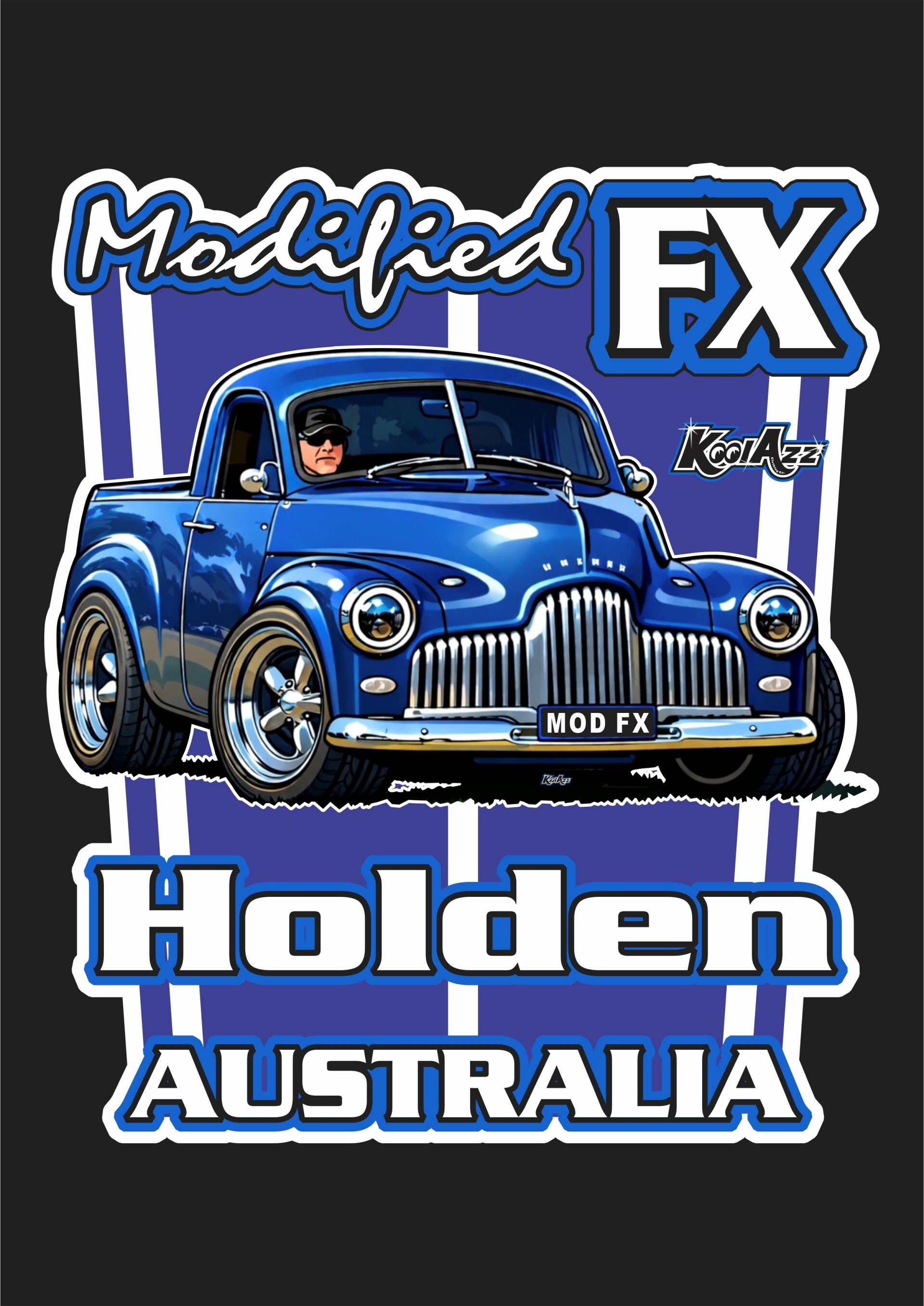 MODIFIED FX HOLDEN UTE AUSTRALIA BLUE, SMALL PRINT LEFT SIDE CHEST, LARGE PRINT ON THE REAR.